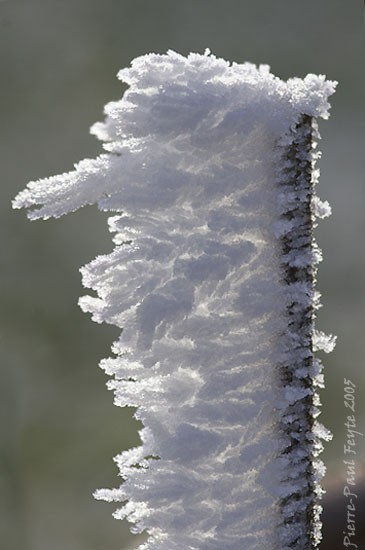 Le givre est quelque chose de magique car il est capable de transformer les paysages en lieux merveilleux, parfois féériques lorsqu'il se dépose sur les arbres, la végétation et même sur les équipements extérieurs, les journées d'hiver; le givre est parfois encore plus impressionnant que la neige car il est capable de tout recouvrir ou de s'accrocher dans tous les sens quand il est associé au brouillard dit « givrant ». Par contre le givre a aussi de nombreux inconvénients que les automobilistes connaissent bien; il se dépose presque obligatoirement par temps de gel lorsqu'il y a du brouillard: en général, la visibilité est limitée, parfois très réduite en cas de nébulosité forte, et il transforme les routes et les rues en chaussées glissantes, et plus particulièrment sur les tabliers des ponts sous lesquels l'air froid circule facilement; une trop grande accumulation peut même casser des branches d'arbres et abîmer des pylônes électriques ! En montagne, lorsque le givre se plaque sur les rochers, il rend la marche ou la grimpette difficile... les alpinistes connaissent bien le phénomène. |  |  | Le givre n'est en fait qu'un simple dépôt de glace qui peut se présenter sous des aspects différents; il provient de la congélation de gouttelettes de brouillard ou de nuages avec des gouttelettes en surfusion (dont la température est négative), et cette congélation se fait sur des objets dont la surface est à une température inférieure ou égale à 0°C. La beauté de ces cristaux n'est plus à vanter, ils peuvent prendre des formes diverses en fonction des changements de vent en direction et en puissance; des aiguilles de givres peuvent devenir très longues, presque irréelles. Le givre accumulé sur les arbres tombe facilement dès que l'on dépasse le seuil de 0°C, ce qui peut former des couches importantes au pied des arbres. C'est que le givre se dépose principalement sur des objets qui sont exposés au vent. En altitude, le vent violent augmente son accumulation comme on a pu le connaître chez nous en décembre 2007 même en plaine. L'épaisseur de ce dépôt peut atteindre une couche importante et ,en altitude, on a déjà pu relever près d'un mètre de cumul en 24 heures toujours dans la direction d'où souffle le vent. | Dans l'atmosphère loin de tout relief, il se dépose aussi et surtout sur les parties des avions exposées au vent, notamment sur les bords des ailes et des hélices; ceci représente un réel danger car le givre déforme l'aérodynamisme des appareils et peut rendre le pilotage difficile, voire aléatoire. Le poids important de givre qui a pu se déposer sur les fuselage et les ailes est parfois suffisant pour déséquilibrer un appareil et rendre les atterrisages osés. Pour éviter ces risques que l'on trouve même en été aux altitude élevées auxquelles volent les jets de nos jours, les avions de ligne modernes sont équipés de systèmes automatiques de dégivrage. C'est entre 0 et -10° que l'on observe les givrages les plus importants, l'air plus froid étant en général beaucoup plus sec car il ne peut pas contenir beaucoup d'humidité à très basse température, c'est une loi de la physique. Jean-Sébastien Beck |  | |