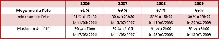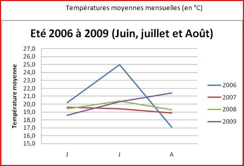 Comparons la saison estivale 2009 en Alsace centrale avec celles des 3 dernières années et utilisons pour cela les données enregistrées par la station météo de Kintzheim au cours des mois de juin, juillet et août de ces 4 dernières années (2006 à 2009).