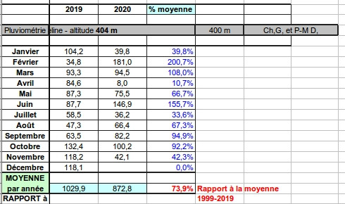 Ce troisième document indique le cumul de pluie au 30 novembre 2020 à Ban de Laveline (altitude 400 m), à quelques km du poste d’Ovenchères sur Fave.