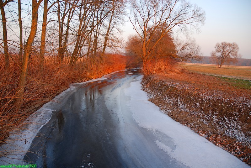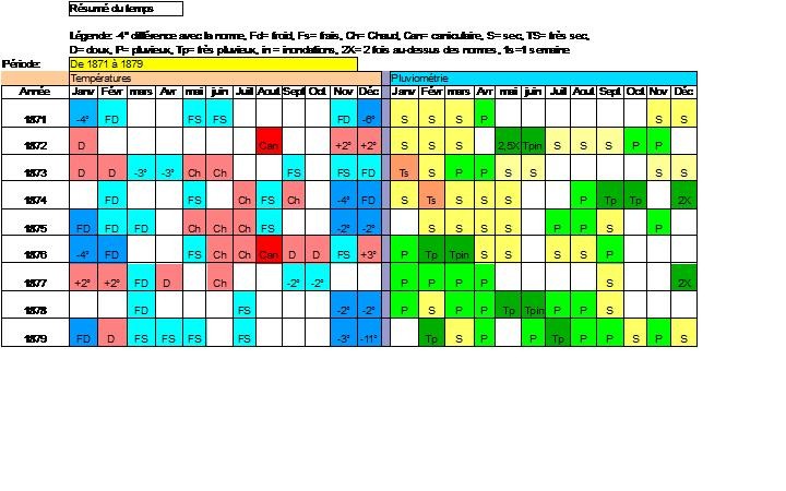 Le temps de 1871 à 1879 de 1871 à 1875 : des hivers et des printemps secs A la suite de la vague de froid de décembre 1870 qui a transformé les opérations militaires en véritable calvaire, l'hiver 1871 continue sur la lancée avec des températures encore très basses en janvier : on relève encore -16°C en Alsace. Les températures sont de 4°C sous les normes en janvier mais le mois de février est plus agréable. Le temps reste par ailleurs sec de janvier à mars. Par contre, avril est très pluvieux et la fin du printemps est fraîche de mai à juin. L'été est au rendez-vous sans excès et l'automne ne dénote qu'à partir de novembre. En effet, durant ce mois, le froid commence à sévir dans une ambiance plutôt sèche comme c'est également le cas en décembre : le temps devient vite glacial avec des températures très basses puisqu'il fait déjà -21°C le 9 décembre. Les températures sont de 6°C sous les normes pour le dernier mois de l'année. En 1872 l'hiver est assez sec de janvier à mars avec une certaine douceur qui se maintient le premier mois de l'année. Le printemps est fort respectable avec toutefois un mois de mai très pluvieux où tombent 2,5 fois les quantités de pluie habituelles. Mais c'est au mois de juin que tout se complique avec une terrible crue du Rhin qui fait beaucoup de dégâts dans les zones inondées dans la plaine d'Alsace. Heureusement que, de juillet à septembre, il ne tombe pas de grandes quantités de pluie; début août, il fait même très chaud avec une canicule qui dure une semaine. Octobre et novembre sont de nouveau bien arrosés. De plus, il règne la douceur de novembre à décembre, ces deux mois sont de 2° au-dessus des normes. L'hiver 1873 reste très doux et sec avec très peu de neige, il est même très sec en janvier. Le manque de glace sur les étangs qui servent à fournir les glacières des brasseries strasbourgeoises qui n'ont que cette ressource pour stocker la bière durant la saison chaude, oblige les brasseurs à importer de la glace de Suède et d'Allemagne du Nord par le chemin de fer. Une certaine fraîcheur se maintient de mars à avril qui sont de 3°C sous les normes; il pleut beaucoup pendant cette période. La fin du printemps est chaude et bien plus sèche que d'habitude; les chaleurs sont même fortes en avril où l'on a relevé +28°C. L'été se passe sans excès puis le mois de septembre se montre assez frais. La fin de l'année devient froide sans brusques écarts de températures de novembre à décembre, deux mois qui restent assez secs. En 1874 l'hiver est de nouveau sec de janvier jusqu'au mois de mai, presque sans pluie en février où il fait relativement froid de même qu'en mars, mais sans excès. La fraîcheur perdure en mai. Après un début d'été agréable notamment au mois de juillet qui est chaud, le temps devient pluvieux et même très frais en août. Début septembre il fait de nouveau chaud. Les récoltes fourragères sont mauvaises à cause du temps trop sec en hiver et au printemps et on doit importer de la nourriture pour le bétail. On reprend également les travaux d'endiguement du Rhin à cause du risque d'inondations lors des crues du fleuve. Septembre et octobre sont très peu arrosés et le mois de novembre devient rapidement hivernal, il est de 4°C sous les moyennes. Dès le 25 novembre une vague de froid pointe le bout de son nez et va régner sur la région jusqu'en janvier 1875. Décembre reçoit de bonnes précipitations, deux fois la norme, sous forme de neige mais aussi de pluie lors de brefs redoux. L'hiver 1875 est froid jusqu'au 17 janvier; le gibier qui a subi les rigueurs de l'hiver depuis fin novembre, est décimé ; des loups, qu'on croyait disparus de notre région, rôdent autour de villages du sud du Haut-Rhin, comme à Dannemarie. Le temps se radoucit rapidement fin janvier et devient même très doux et pluvieux. Février est de nouveau froid; un temps sec prend le relais de février à juin; en février il n'y a d'ailleurs pratiquement pas de précipitations. Le mois de mars reste hivernal puis le printemps s'installe normalement. L'été est chaud, il commence même très tôt avec de bonnes chaleurs en mai et en juin; le contraste vient début août qui devient très frais avant le retour de fortes chaleurs à partir du 17 août. L'été est bien arrosé de juin à août puis septembre se montre assez sec. Après un automne agréable, il fait de nouveau très froid à partir du 30 novembre; l'ensemble du mois est bien plus arrosé que d'habitude et accuse un déficit des températures de 2°C; décembre suit le même chemin ! On note également une baisse de l'activité solaire qui va se prolonger jusque vers 1915. de 1876 à 1879 : des années humides En 1876 l'hiver est rude en janvier et en février; une période de froid sec sévit du 4 au 18 janvier avec -11°C en plaine le 11 du mois. Une nouvelle période froide débute le 24 janvier et va durer jusqu'au 14 février avec -14° les 12 et 13 février. Janvier est de 4° sous les normes. Le temps est assez humide avec beaucoup de neige et de pluie surtout fin février et tout au long du mois de mars. Le 3e mois de l'année est très agité avec une tempête le 12 mars alors que les thermomètres indiquent +10°C en plaine. A cause des pluies continuelles, des inondations ont lieu dès le 25 mars. Il fait chaud à partir du 1er avril et cela va durer jusqu'au 11 du mois, les températures plafonnant toutefois à +20°C. Des gelées tardives prennent le relais le 14 avril et il tombe même de la neige localement jusqu'en plaine. Dans l'ensemble, avril et mai restent assez secs bien que le mois de Marie reste frais. Il commence à faire très chaud fin juin et l'été va continuer sur cette lancée en juillet et en août également très secs. Dès le 9 août , c'est même la canicule, car il fait 30°C du 9 au 12, 31°C le 13 et jusqu'à 33°C le 14 août. La sècheresse s'aggrave : les réc