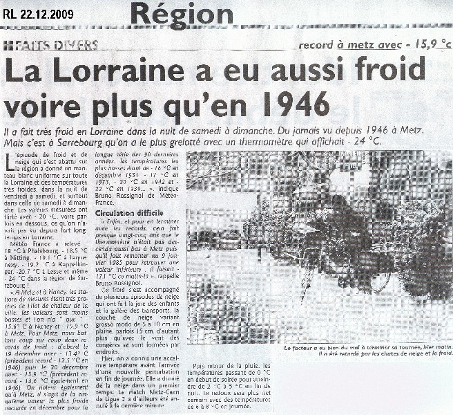 Bilan de décembre 2009 1 Le déroulement : Du 1er au4 décembre : passage perturbé atténué Le temps est faiblement pluvieux le 1er décembre au passage d’une perturbation ; un temps humide et frais, souvent porteur de grisaille, voire de brouillards, en matinée prend le relais du 2 au 3 mais le soleil est de la partie dans l’après-midi, plus généreusement en plaine ; à l’arrière d’un front froid très atténué les gelées matinales se généralisent le 4 décembre. Du 5 au 11 décembre : retour à un temps perturbé et doux Après les gelées matinales du 5 décembre un temps doux pour la saison concerne toute la région ; les pluies faibles du 5 font place à des pluies modérées à assez fortes du 6 au 7 ; celles-ci deviennent même fortes le 8 décembre, jour où l’on peut entendre localement quelques coups de tonnerre au passage d’une traîne assez active. Après une accalmie le 9, nous subissons une nouvelle onde pluvieuse les 10 et 11 avec, en fin de période, le début d’une baisse importante des températures. Du 12 au 21 décembre : premier coup de froid de l’hiver Dès le 12 décembre c’est le retour des gelées matinales et des flocons de neige encore mêlés à la pluie en début de période; le froid s’accentue progressivement avec de faibles chutes de neige intermittentes et durables sous un vent d’ENE sensible jusqu’au 15. Ce temps faiblement neigeux se poursuit alors que le froid s’accentue du 17 au 20. La neige est plus sérieusement de la partie à partir du 19 décembre et blanchit les sols jusqu’en plaine. Les températures baissent encore et les journées ne connaissent pas de dégel dans de nombreuses stations ; les températures deviennent même extrêmes dans la nuit du 19 au 20 décembre avec un mercure qui flirte avec les -20° et souvent descend bien plus bas comme à Réding où l’on a relevé -24,3°C. Le 20 dans l’après-midi un front chaud avec l’amorce d’un redoux provoque de fortes chutes de neige, d’abord poudreuse puis humide et lourde, sous un vent fort d’OSO qui arrive à former des congères notamment sur les routes secondaires ; le verglas se forme également sur les chaussées gelées en profondeur ! Du 21 au 25 décembre : plusieurs ondes pluvio – neigeuses avec un redoux progressif Le temps reste agité au passage de fronts qui donnent des pluies mais aussi des neiges dans la nuit et en matinée à basse altitude ; le vent est fort le 22 décembre et le mercure dépasse la barre des +10°, parfois seulement quelques heures dans la journée ou dans la nuit, les fronts froids ramenant de la neige dans une ciel de traîne souvent actif ; le 25 décembre les vents sont également très soutenus de SO et les pluies donnent des cumuls très importants durant cette période ; des cours d’eau sont en crue. Du 27 au 31 décembre : une nouvelle perturbation avec de la douceur Après l’accalmie du 27 décembre, une nouvelle onde pluvieuse apporte d’abord de la neige le 28 ; les pluies arrivent rapidement à la suite dans la nuit du 29 au 30 ; les pluies sont de nouveau assez fortes mais commencent à faiblir le dernier jour de l’année avec l’arrivée par le NO d’un nouveau coup de froid qui marquera le début de l’année 2010. 2 La synthèse : Ce mois de décembre 2009 n’a laissé personne indifférent ! Très contrasté, il est le résumé de ce que notre région tempérée, entre climat océanique et climat continental, peut vivre d’un point de vue météo en cette saison. Après un mois de novembre très doux et humide, décembre reste sur la même lancée en début de mois mais le froid aura également la part belle pendant une dizaine de jours ! Les températures moyennes sont à peu près conformes aux normes de saison : ceci dit , cette affirmation est trompeuse car les contrastes restent très forts pendant les différentes périodes du mois (voir le déroulement) et l’amplitude thermique mensuelle dépasse les 30° dans de nombreuses stations. Il faut également noter que les températures minimales moyennes sont plus basses que la norme mais que les moyennes des maximales, au contraire, sont plus élevées. Donc, comme nous le disons souvent, méfions nous des moyennes car même si elles semblent normales elles peuvent cacher de grandes disparités au sein d’une période donnée… et ce fut bien le cas en décembre 2009 ! Pour les précipitations la coupe déborde ! Après un mois de novembre déjà (trop) bien arrosé, les différentes perturbations qui ont concerné la région se sont montrées plus que généreuses en quantité que ce soit sous forme de pluie ou de neige ! Il est tombé en maints endroits plus du triple des précipitations normalement attendues ; ce sont surtout nos amis Lorrains qui ont connu quelques déboires avec des cours d’eau en crue. Il y a beaucoup de jours de précipitations, presque une vingtaine de plus de 1 mm dans de nombreuses stations ; les jours de neige ou de neige mêlée de pluie atteignent également une quinzaine de jours sur le nord de la région. On compte environ 8 jours de verglas au sol dans pas mal de stations. Le vent a également soufflé assez fort durant 8 jours, la plupart du temps de OSO mais également du secteur Est ; pendant 2 jours notre région a été secouée par des vents forts qui ont pu commettre quelques dégâts dans nos forêts chargées de neige lourde et mouillée. L’ensoleillement n’a pas été des plus généreux, la présence des nuages a occulté trop souvent le ciel durant le mois. La pression atmosphérique est majoritairement en baisse pendant 21 jours avec des minima assez rares, localement inférieures à 985 hPa ; mais la remontée des baromètres a parfois été spectaculaire lors de la mise en place de dorsales anticycloniques ; la moyenne de la pression est nettement sous la moyenne de référence. En conclusion, on peut affirmer sans se tromper que décembre 2009 nous a réservé bie