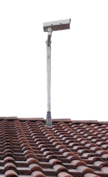 Le caisson est fixé le long d’un mat en acier de 3m de long qui lui-même est fixé sur la charpente, la partie visible ressort à travers une tuile en plomb sur une hauteur de 1.50m. La partie extérieure sera haubanée au printemps pour limiter le risque de vibrations par vent fort.